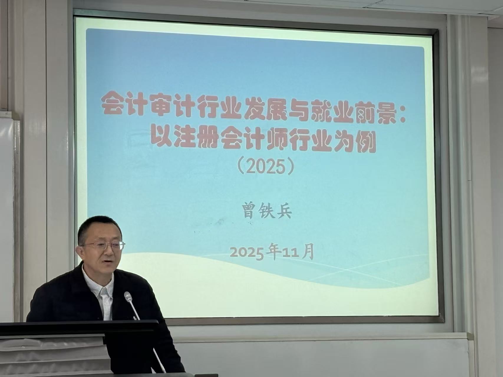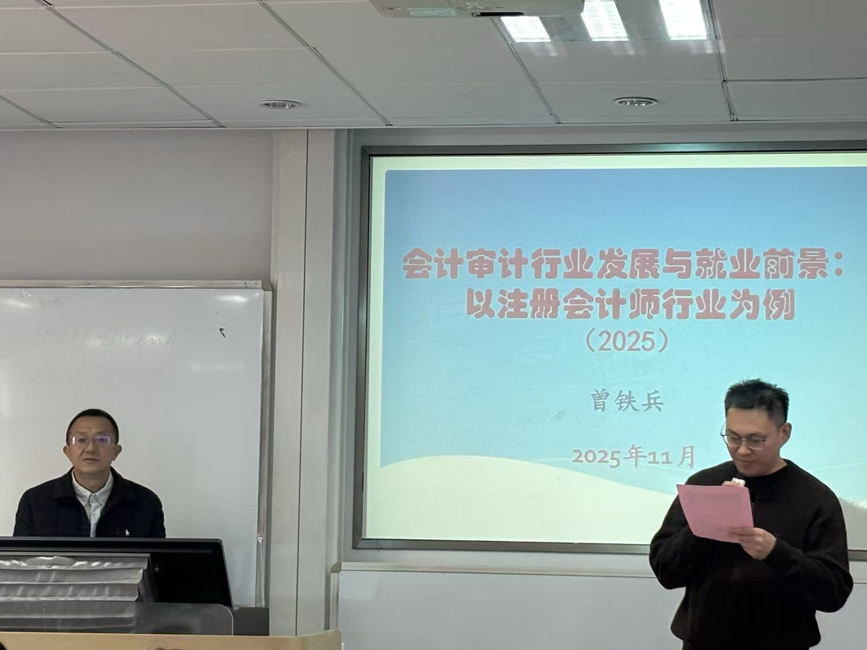 2025年11月26日,会计学院邀请曾铁兵主编作了一场高水平的学术交流活动。会议伊始,会计学院MPAcc办公室主任张金泉博士对曾铁兵的学术背景和主要成就作了简要介绍,随后邀请曾铁兵围绕行业现状、研究方向及职业机遇展开深度解读,为会计专业从业者与研究者厘清了行业脉络。