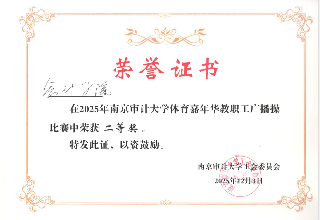 为响应学校全面加强和改进新时代体育工作的号召,丰富校园体育文化生活,12月3日下午,南京审计大学教职工广播操比赛和趣味项目比赛在润园操场如期举行。会计学院分工会组建的教职工广播操参赛队伍凭借整齐划一的动作、昂扬向上的风貌,在激烈角逐中脱颖而出,荣获二等奖的优异成绩。